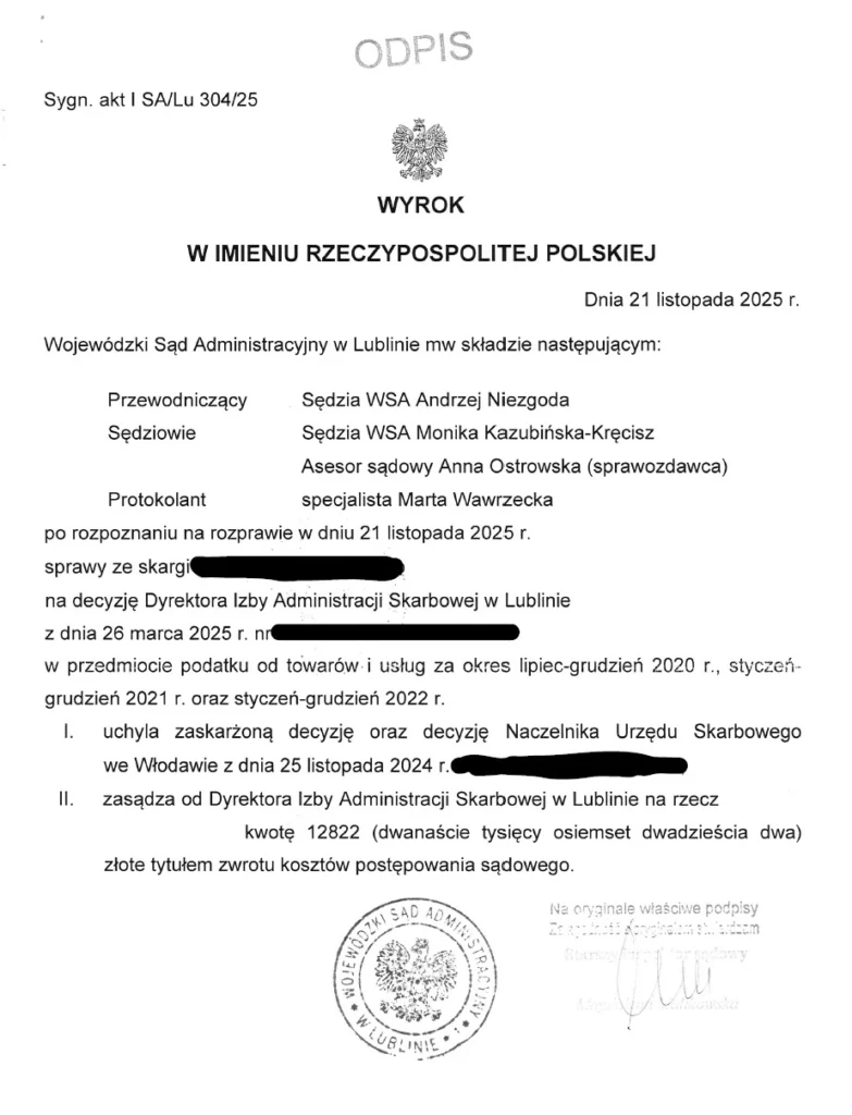 Właśnie pojawiło się uzasadnienie wyroku WSA w Lublinie z 21 listopada 2025 r., sygn. akt I SA/Lu 304/25. Sprawa ta dotyczyła określenia zobowiązania podatkowego w podatku VAT od sprzedaży nieruchomości wobec reprezentowanej przez nas osoby fizycznej ( sprzedaż działek VAT ). O sprawie tej pisaliśmy wcześniej.
